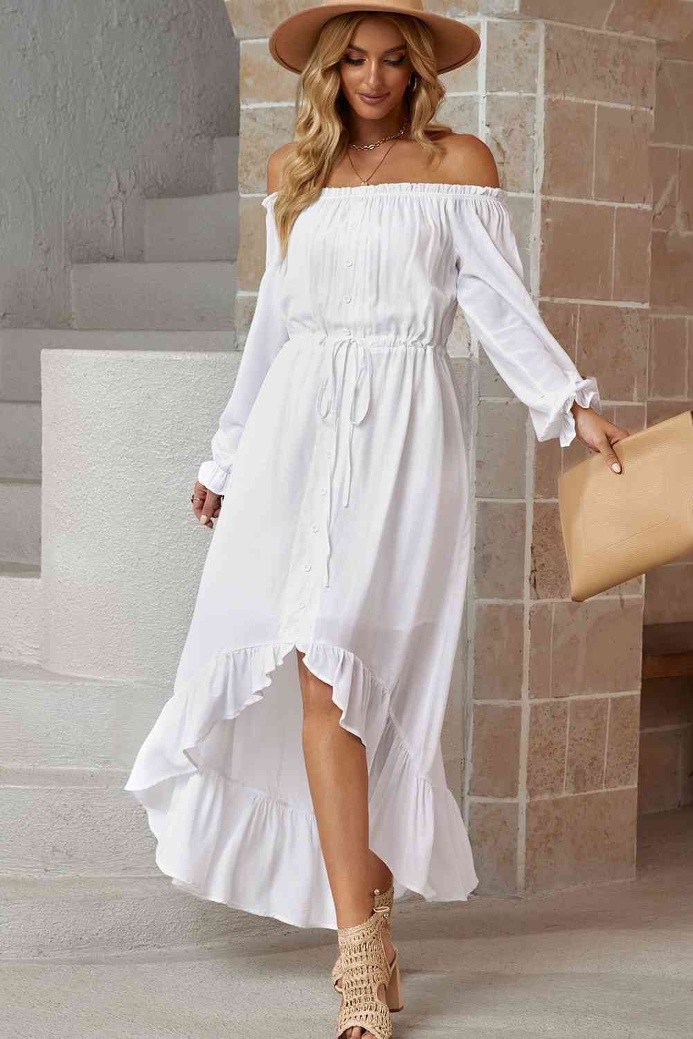 Decorative Button Ruffled High-Low Off-Shoulder Dress