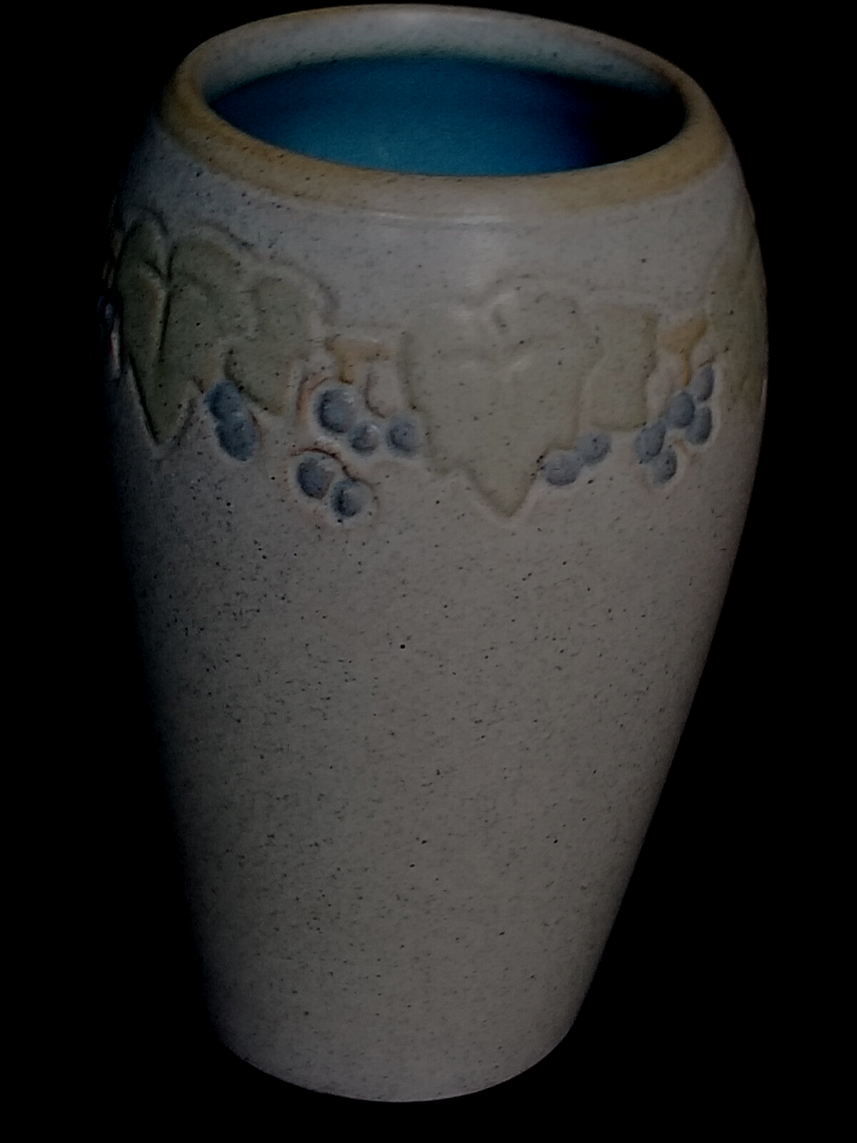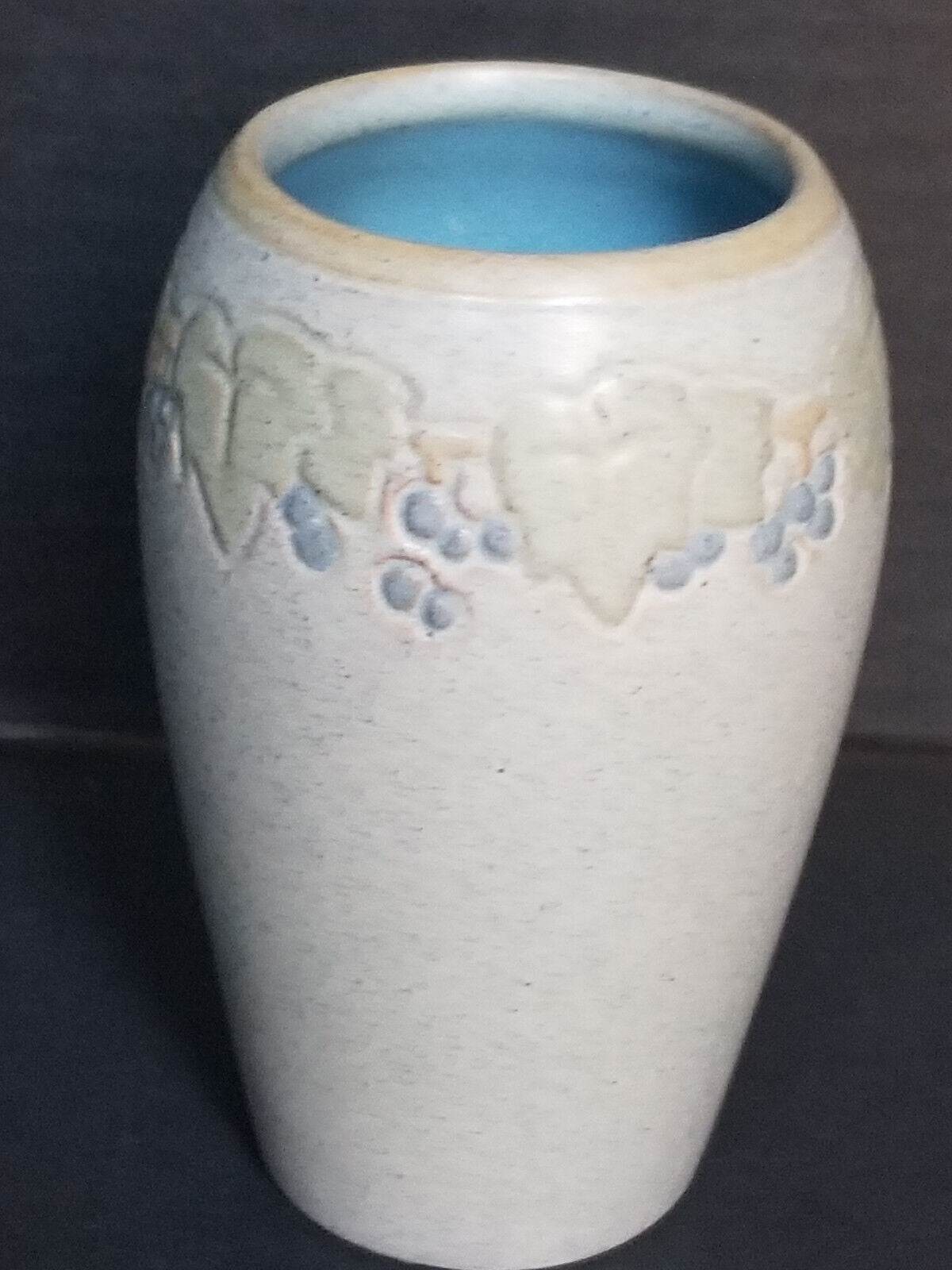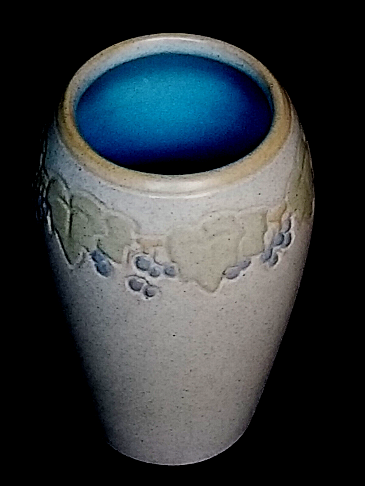Early Marblehead vase dating early 1900's with engraved grapes and leaves which are handpainted