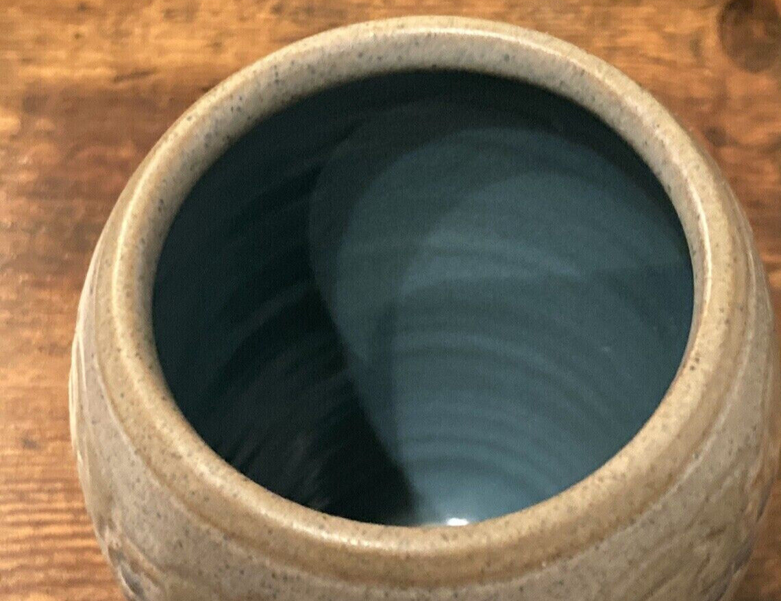 Done in Subtle matte glaze in four colors on a gray speckled body color. the inside has the robin egg signature blue color