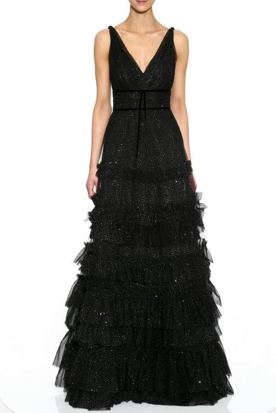 With a captivating v-neckline and delicate gold dots, this gown exudes sophistication. The tiered design adds movement, making it a perfect choice for elegant affairs. Make a statement with this black gown adorned with celestial-inspired gold dots, a true embodiment of refined charm.