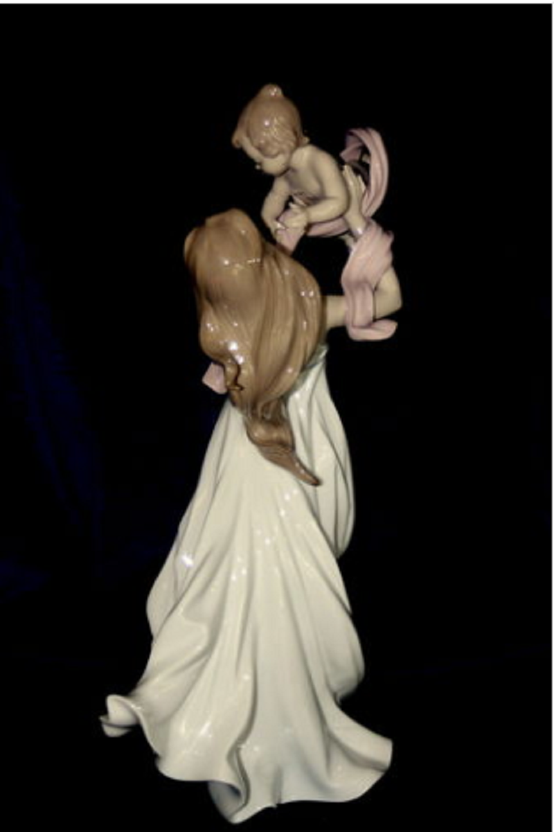 Glossy porcelain figurine of a mother lifting her baby with a loving gesture in a long white folded dress.